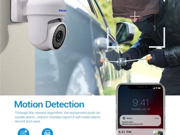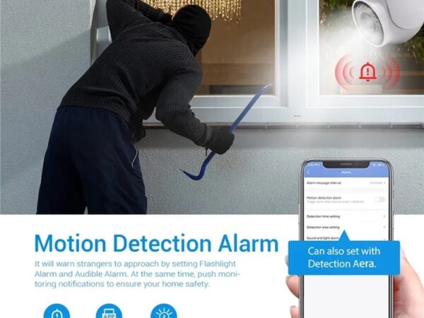 - Support motion detection alarm, APP message push, white light flashing, and alarm sound warning