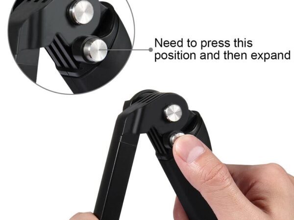 - За да разгънете или сгънете раменете на монопода развийте двата странични болта, след което натиснете сребристия бутон горната част на дръжката;